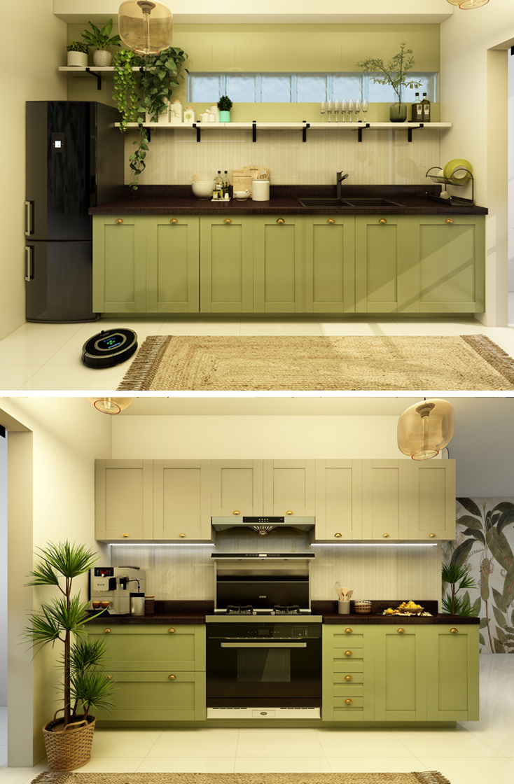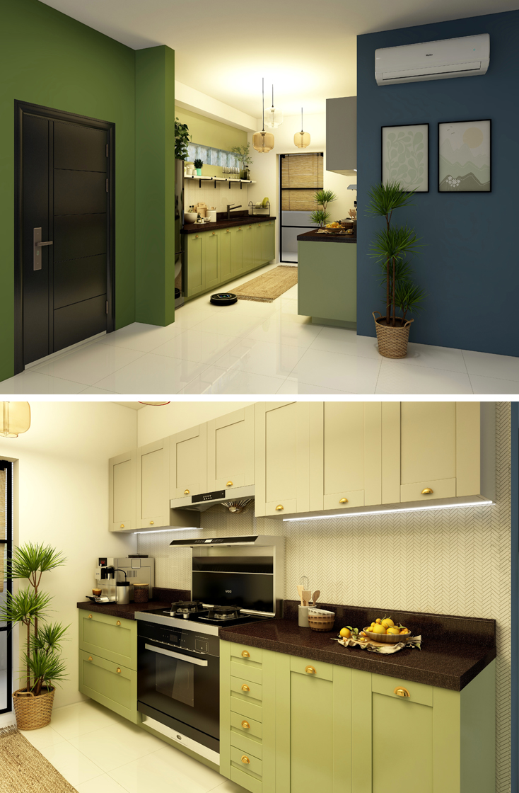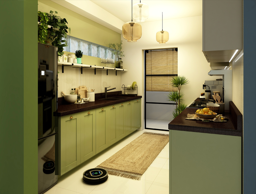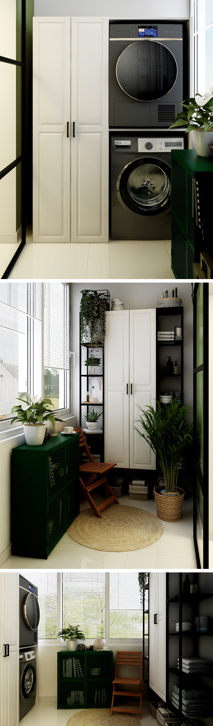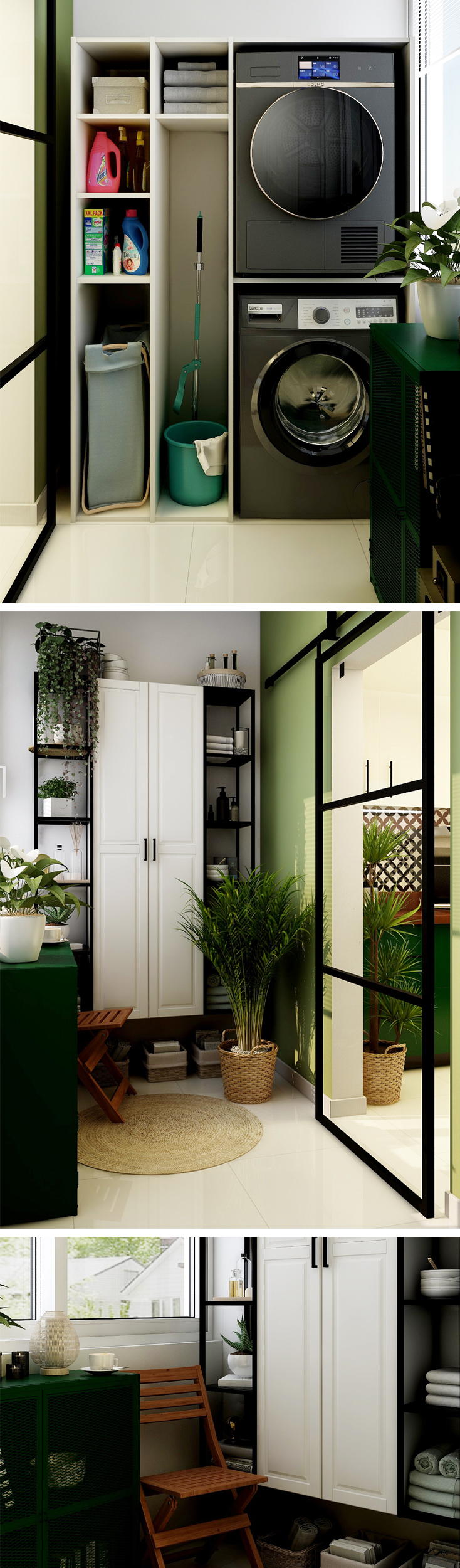 Kitchen with loundery for the client from Puerto Rico. I love your vivid style and bright colours with joy for life. When designing a kitchen with a laundry area for a client from Puerto Rico who appreciates vivid style and bright colors, consider creating a vibrant space that exudes joy for life. Opt for a green color scheme to bring a refreshing and tropical feel to the kitchen, complemented by a dark wooden countertop for a touch of warmth and contrast. Incorporate ample storage solutions to keep the space organized and functional, while also adding decorative elements such as plants or artwork to enhance the lively atmosphere. To maximize efficiency, ensure that the laundry area is conveniently located and equipped with modern appliances. Embrace natural light to create a bright and airy environment that reflects the vibrant spirit of Puerto Rico.